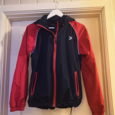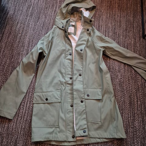 Jakken fremstår som ubrukt. Hetten kan tas av.