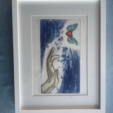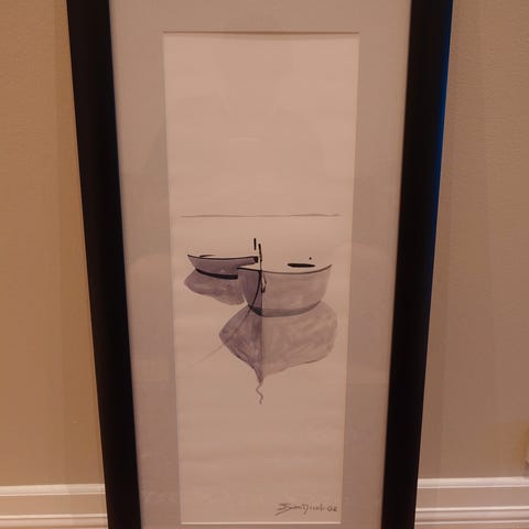 Bredde 32,5 cm og høyde 42. Signert originalakvarell fra kunstner; Ole Snare. Bildet viser en mannlig figur med mørke og jordfargede toner. Bildet er innrammet med en enkel, lys grå treramme. Passer til dekorasjon i hjem eller galleri. Selges.
