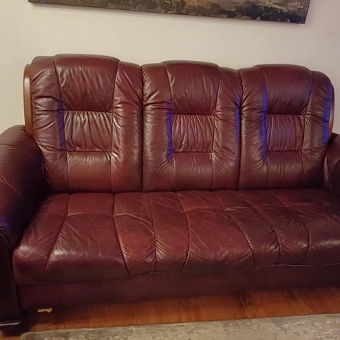 God sofagruppe i skinn selges, bestående av en 2 seter og en 3 seter. Veldig myk og behagelig noe slitt i sittepute på 3 seter. Mulig det kan behandles.