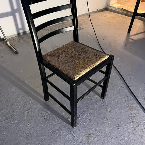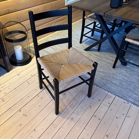 Stilrene jærstoler med fire spiler. Hele og stabile med naturlige bruksmerker. Setene bør rengjøres da puter har farget av -særlig ene stol har en flekk. Selges samlet 6000 eller 1200 per stol. Kr 800 for den med flekk.