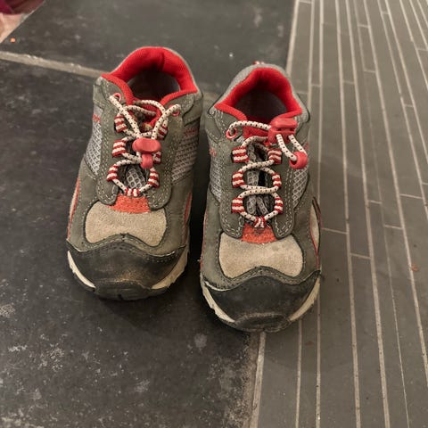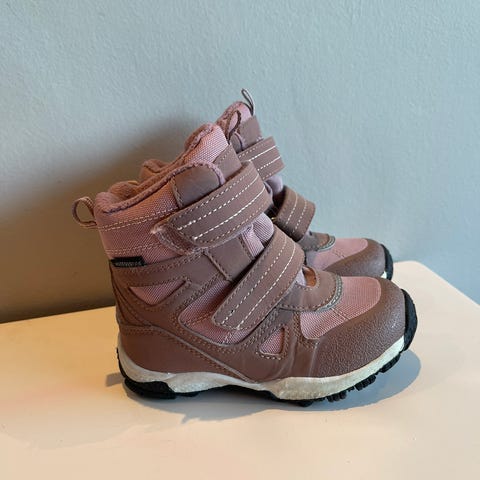 Timberland barnesko i størrelse 26. Skoene har en kombinasjon av materialer med tekstil og semsket skinn i blå og brune toner. De er designet med snøring og har en robust såle for godt grep. Egnet for barn.