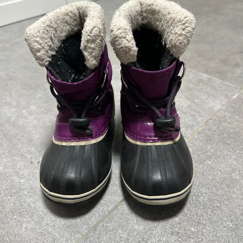 Sorel barn vintersko for jente i størrelse 29. Skoene har en lilla farge med svart gummisåle og er foret med mykt, isolerende materiale for varme og komfort. Lite brukt en halv sesong.
