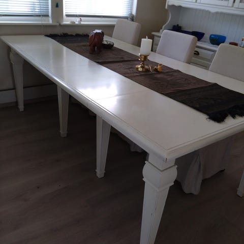 Pent spisebord med en "båtform" hvor det er 100cm bred på det bredeste og 80cm på det smaleste. Hver ileggsplate er 49cm slik at bordet kan bli opptil 258cm langt. Overflaten er i hvit laminat (ikke høyglans).