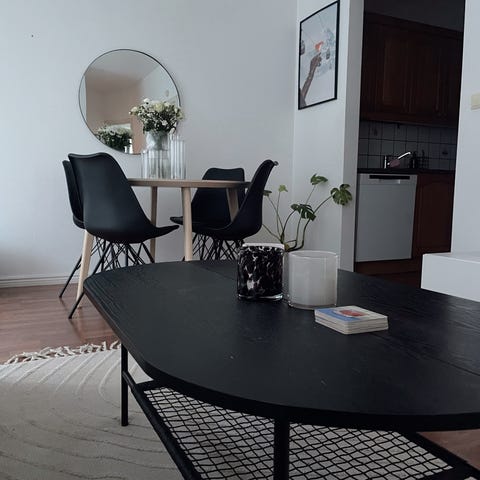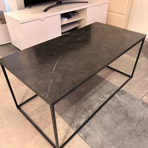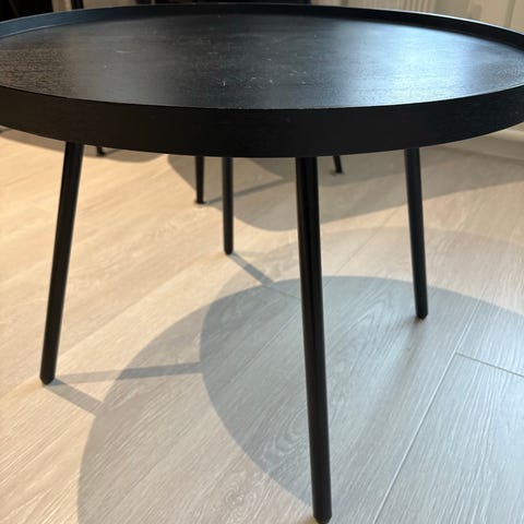 Pent sofabord beskrevet som brunsvart men som fremstår helt sort i mine øyne. Et par veldig små hakk der fargen fargen er flaket av men ikke noe særlig merkbart. Må hentes i Oslo
