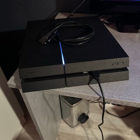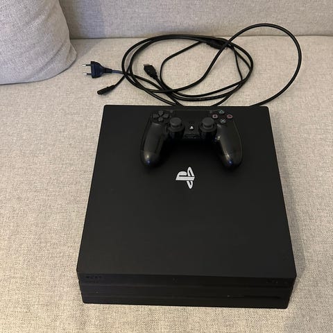 Sony Playstation 4 spillkonsoll med to svarte kontroller. Konsollen er designet for videospill og tilbyr tilkoblingsmuligheter for flere spillere med de medfølgende kontrollerne. Prisen er ferdig prutet.