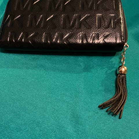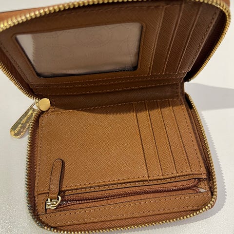 Michael Kors dame lommebok laget av lær. Lommeboken har flere kortlommer, en gjennomsiktig ID-lomme, og en romslig glidelåslomme for mynter eller små gjenstander. Designet for praktisk oppbevaring og enkel tilgang.