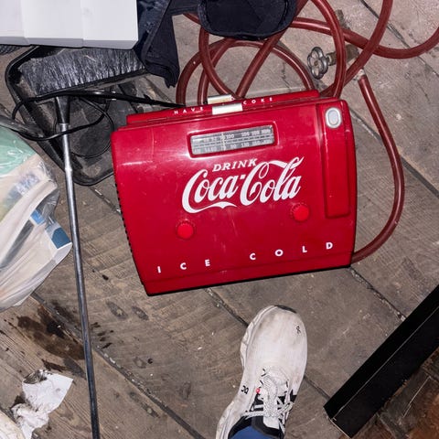 Tro kopi av Coca Cola automat fra 1970- tallet. Radioen er i pen stand, men batteriholderen må fikses.