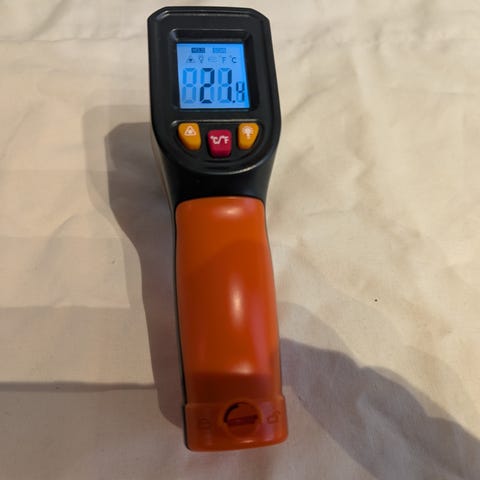 Ooni Infrared Thermometer med laserpeker. Infrarødt termometer designet for å måle temperatur på overflater uten direkte kontakt. Utstyrt med laserpeker for presisjonsmåling, egnet for bruk ved matlaging og andre oppgaver som krever nøyaktig temperaturmåling.