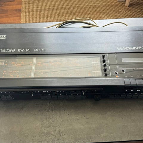 Den spiller plater, kassetter, CD, bluetooth og har både DAB+ og FM/AM radio.