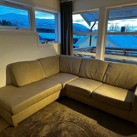 Godt brukt hjørnesofa med chaiselongue gis bort. Fra Home & Cottage. Cirka 10 år gammel. Den er godt nedsittet, den har et par flekker som ikke fikk bort i vask. Trekket som er på den er farget brunt (originalfargen er som putene), den har skjolder etter fargingen og lukter sikkert hund. Men den har mange år igjen og for å si det sånn er det ikke jeg som ville bytte den ut…