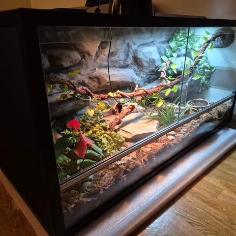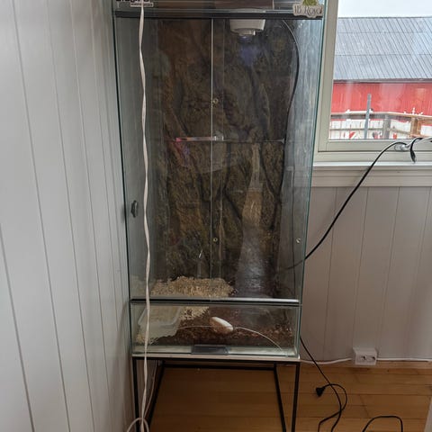 Glass terrarium med varmeplate og dekor. Terrariet har glassvegger med tilkoblet varmeplate for temperaturregulering. Inkluderer dekorativ bakgrunn for naturlig utseende. Egnet for reptiler eller små dyr som krever oppvarmet miljø.