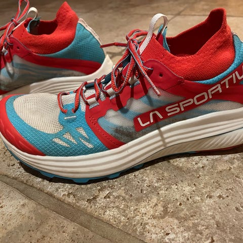 Pent brukte terrengsko fra La Sportiva i størrelse 39. Passer løpe- og gåturer i fjell, skog og mark. Godt mønster under. Lite brukt og minimalt med bruksmerker. Hard gummikant for beskyttelse av tær.