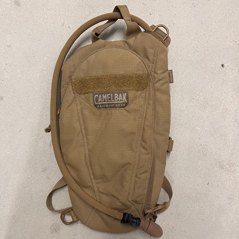 CamelBak Drikkesystem Hydration Pack i grønn farge. Utstyrt med drikkeslange og munnstykke for enkel tilgang til væske under aktivitet. Designet for praktisk væskebæring ved utendørsaktiviteter.