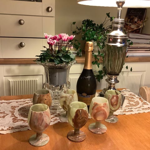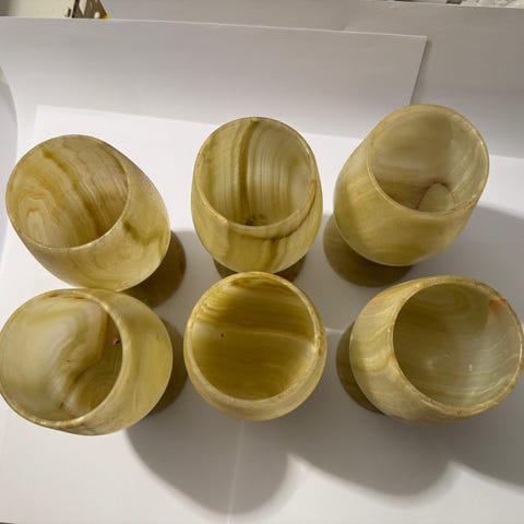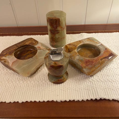 Onyx karaffel med seks tilhørende glass og et serveringsbrett, laget i onyx med naturlige fargemønstre. Karaffelen har en kuleformet kork og settet er egnet for servering av drikkevarer.