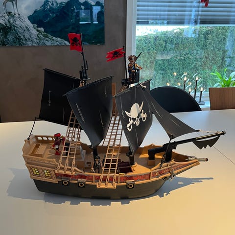 Playmobil Piratskip leketøysmodell med detaljer som kanon, seil med piratmotiv, anker og sjørøvere. Modellen har realistiske elementer som tauverk og dekorative detaljer på skroget. Egnet som samlerobjekt eller lekeelement for barn.
