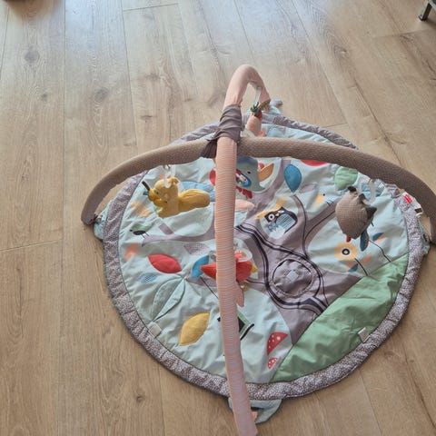 Fisher-Price lekematte med aktivitetsbue, fargerik med dyremotiver. Laget av tekstilmateriale, designet for små barn til lek og stimulering.