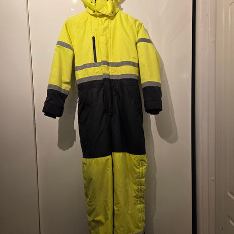 Super vinterdress som holder deg tørr, varm og synlig på mørke kvelder. Dressen mangler hetten og har et hull på det ene kneet, selges derfor billig. Mye bruk igjen.
