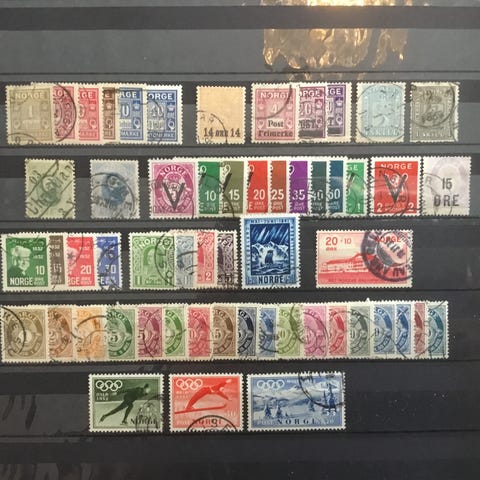 Samling av frimerker med ulike merker og motiver. Inneholder et variert utvalg av farger og design, samlet på flere sider. Egnet for samlere eller som en del av en frimerkesamling.