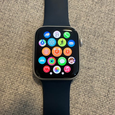 Selger Apple Watch 6 series 44 med blå tekstilreim og lader.