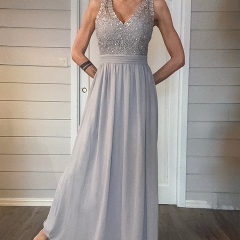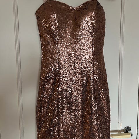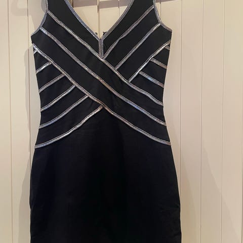 Floyd selskapskjole i svart farge, størrelse S. Laget av et elastisk materiale, så den kan nok passe en liten M. Kjolen har kort erme og blonder detaljer på overdel.