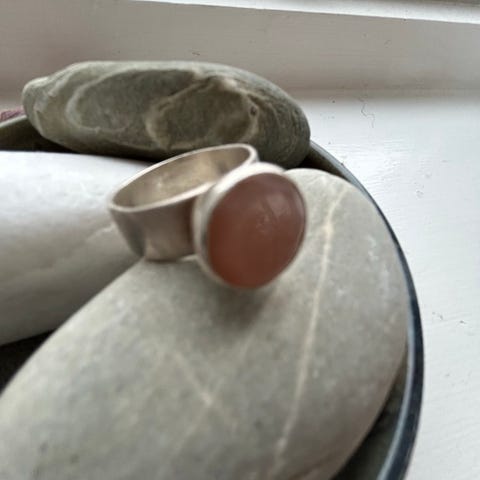 Massiv, korallfarget bohemsk ring. Metallet har et oksidert preg.