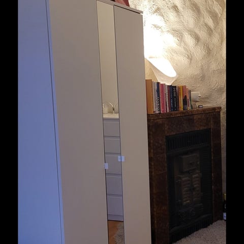 Selger et pent brukt VILHATTEN garderobeskap fra IKEA med svarte knotter! Farge eikmønstret. To dører og to skuffer.