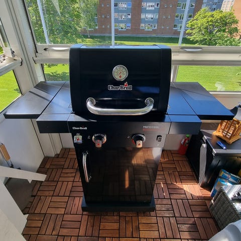 Char Broil gassgrill selges, 2 brennere. Følger også med grilltrekk og propanflaske (tom). Må hentes snarlig pga av flytting.