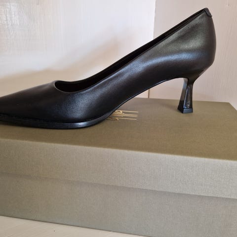 Lekre pumps i blått semsket skinn, med detaljer i svart lakk. Laget i Spania. 8 cm hæl. Brukt én gang.