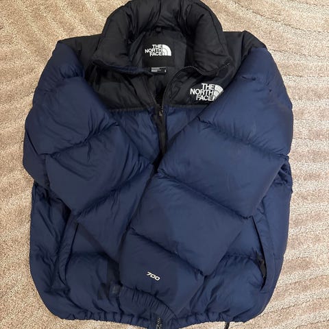 The North Face Jakke i dun for herre, størrelse L. Jakken er blå og laget av dunmateriale, egnet for utendørs bruk.