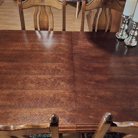 Gir bort komplett spisestue bestående av glassbord og 6 stoler i imitert skinn.