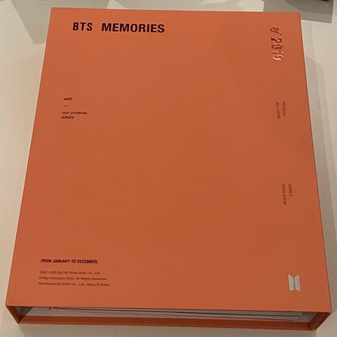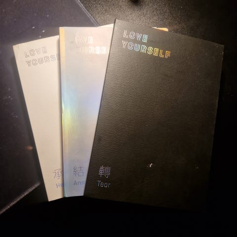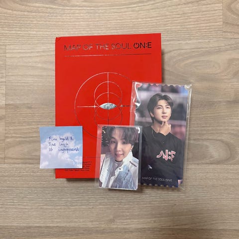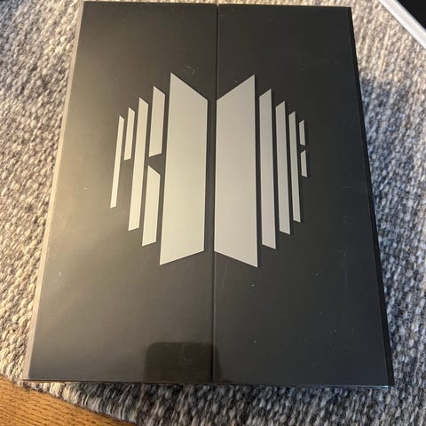 Pakke med BTS plakat og album med flere CD-er i ulike farger. Plakaten viser alle medlemmene i gruppen. Albumet har et omslag med et varmt fargevalg og inkluderer flere disker.
