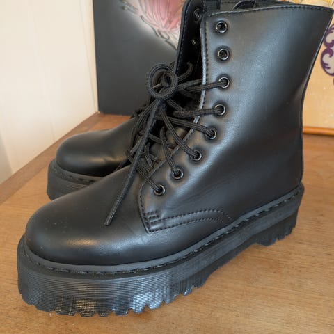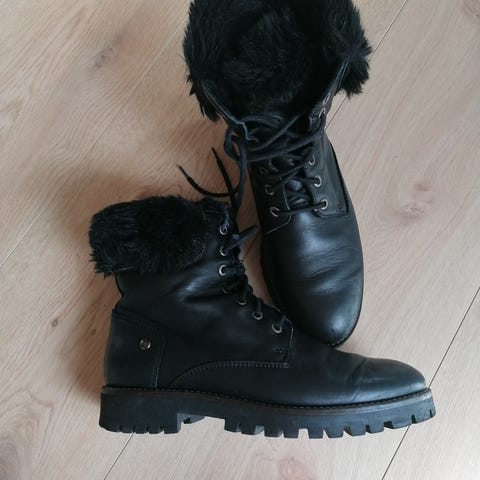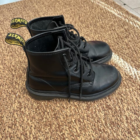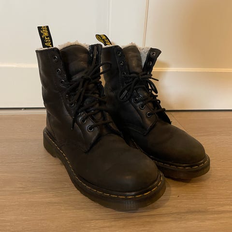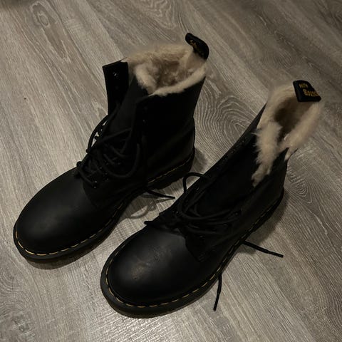 Dr. Martens vinterstøvler i størrelse 39. Støvlene er svarte og foret med et lyst, mykt materiale for ekstra varme. Laget for å gi beskyttelse og komfort i kaldt vær.