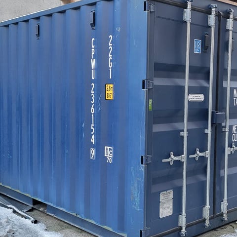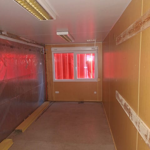 Container har hatt opning på sida for samankobling mot anna container før, men har tetta opningen. Er nye plater på vegger og i himling, samt nytt el-anlegg.