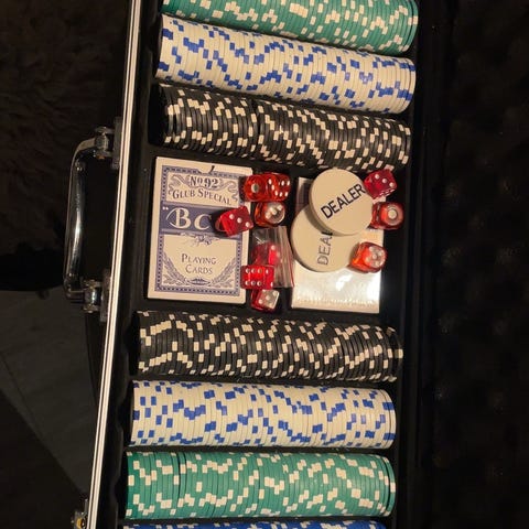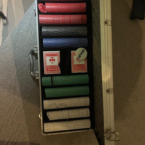 Bicycle Standard pokerchipsett med tilhørende spillekort. Settet inkluderer flere fargede pokerchips og to kortstokker i standard størrelse, pakket i en flott boks. Egnet for pokerspill og andre kortspill.