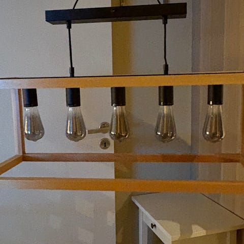 Stor takpendel (47 cm i diameter, ca. 90 cm fra takfeste til nederst på lampen) selges rimelig. Bruker standard E27 lyspære.