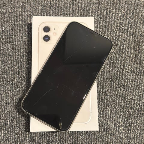 Apple iPhone 11 med 256 GB lagringskapasitet i hvit farge. Telefonen har en skjerm med mindre skader i hjørnet som vist på bildet. Modellens spesifikasjoner inkluderer et dobbeltkamera og en aluminiumsramme. den har en ødelagt framskjerm. innvendige