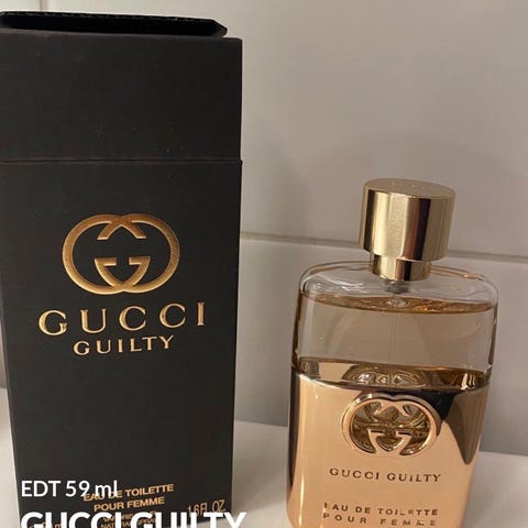 Gucci Guilty Eau de Toilette Pour Femme med en volum på 50 ml. Parfymen kommer i en flaske med gullfarget hette og logo, og er ment for kvinner.