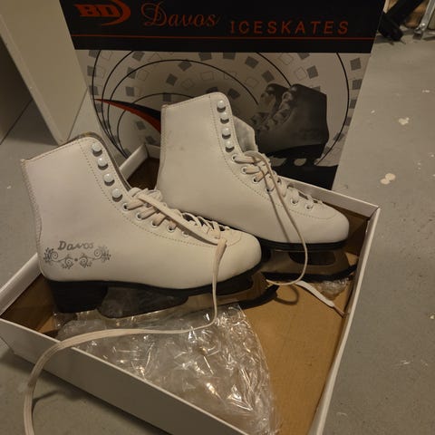 Davos FS-41 skøyter for barn i størrelse 35. Skøytene er hvite med snøring og har et tradisjonelt design for skating.