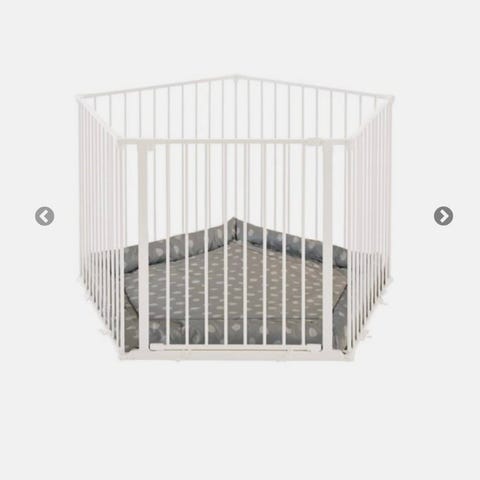 Peisgrind/lekegrind selges. Ligger sammenlagt i originaleske. Grå pute medfølger og veggfeste for å bruke den som peisgrind. Sender ikke