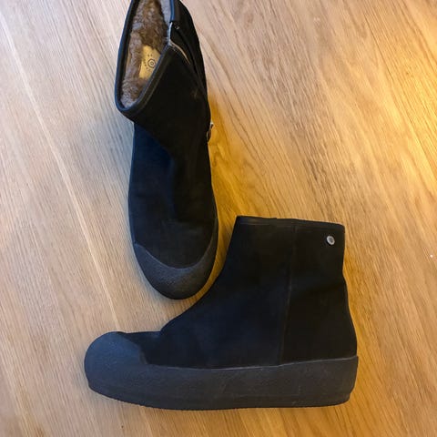 Ganni støvler i størrelse 40. Støvlene har en svart overdel i skinn med elastiske sider for enkel på- og avtakning. Sålen er tykk og grovmønstret i en kontrastfarge. Passer til hverdagsbruk.