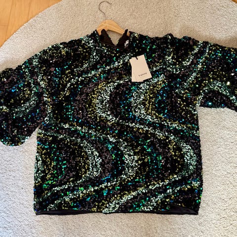 Minimalt brukt glittertopp med fôring innvendig str XL. Fra u.a - u.a er det 60 cm. Litt ballongarmer. Strikk nederst.