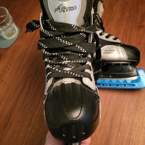 skøyter for barn i størrelse 36. Skøytene er laget for skøytelek og ishockey og har svart, hvit og rød fargekombinasjon.
