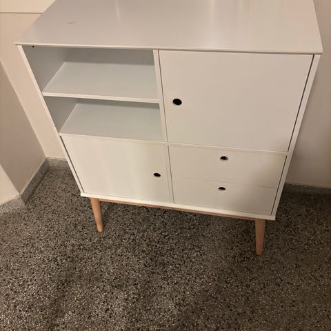 Hvit skjenk selges da det er blitt kjøpt ny. Det mangler en knott til å holde på plass hylla i venstre skap, men det får man tak i mange steder. Selges som den er. Vanlig bruksslitasje, ikke noe godt synlig.