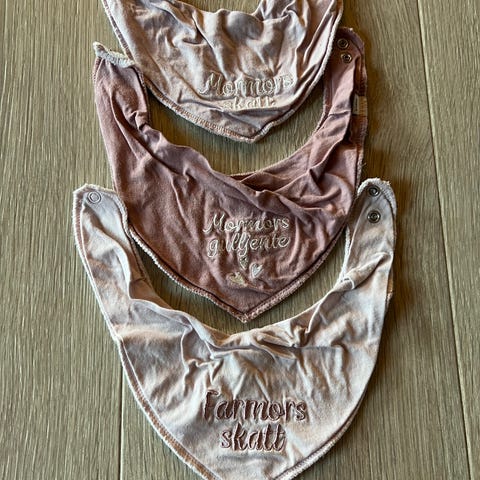Her har vi et sett med to koselige smekker fra det kjente merket, perfekt for de små prinsessene dine! De er i en nydelig lys rosa farge og har søt brodering med «Pappas prinsesse» og «Mammas prinsesse». Smekkene er laget i myk, behagelig bomull som føles deilig mot babyens hud. De har noen mindre bruksmerker, men ellers er de i veldig god stand. Knapper på siden gjør dem enkle å ta av og på. Dette settet blir en morsom og praktisk tillegg til babyens antrekk!
