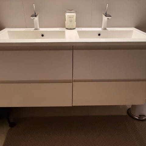 Benkeplate er 190 x 60 cm hvit akryl m Colombovask. Skal byttes ut i uke 3-4 og kan ikke henter før det. Innredning er ny og brukt ca 3 mnd.