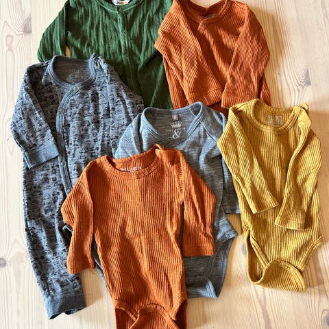 Selger et nydelig og klassisk sett med babyklær i størrelse 68 (ca. 4–6 måneder) fra kjente merker Lindex, H&M og Newbie.