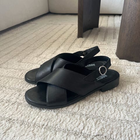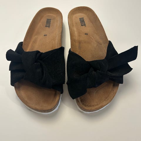 Roots sandaler i størrelse 38 med svart farge. Sandalene har en myk såle og en dekorativ knute på oversiden av ekte skinn. Selges billig!