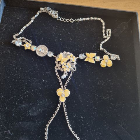 Pent brukt halskjede fra Dansk Smykkekunst. Sølvfarget kjede med dekorativt hjerteanheng med steiner. Smykket fremstår i veldig fin stand og selges med original eske.