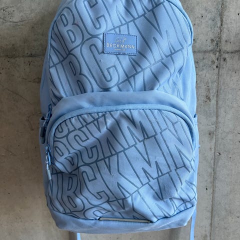 Beckmann gymsekk til å feste på utsiden av skolesekken (eller ha som tursekk). Ene festet mangler,men kan kjøpes løst eller bruke annet. Følger med skonett i egen lomme. Kun brukt få ganger,ser helt ny ut. I fargen grå.