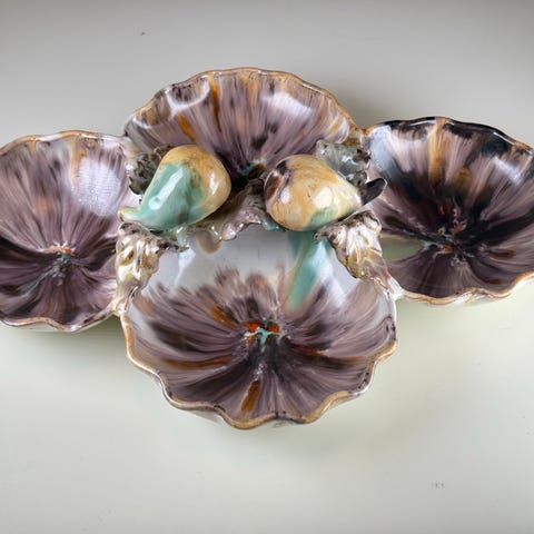 Dekorasjonsfat som består av tre nivåer med porselensfat i forskjellige farger med dekorative mønstre. Fatene er utstyrt med et håndtak i metall for enkel transport og kan brukes til servering eller som dekorasjon.